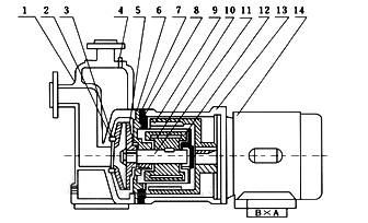 | 8.隔離層 | 9.外磁鋼總成 | 10.內磁鋼總成 | 11.泵軸 | 12.軸套 | 13.聯(lián)接架 | 14.電機 |